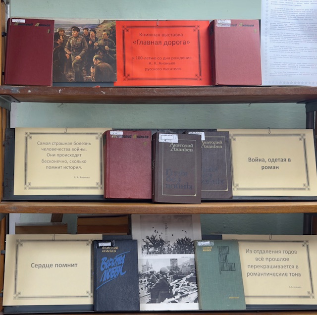 Для читателей библиотеки-филиала № 7 им. Т. Г. Шевченко в г.Симферополе открылась книжная выставка «Главная дорога», приуроченная к 100- летию со дня рождения А. А. Ананьева.