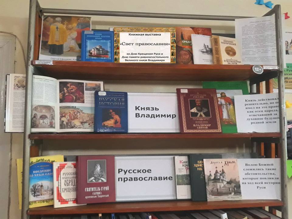 В библиотеке-филиале № 7 им Т. Г. Шевченко открылась выставка «Свет православия», приуроченная Ко Дню Крещения Руси и Дню памяти равноапостольного Великого князя Владимира.