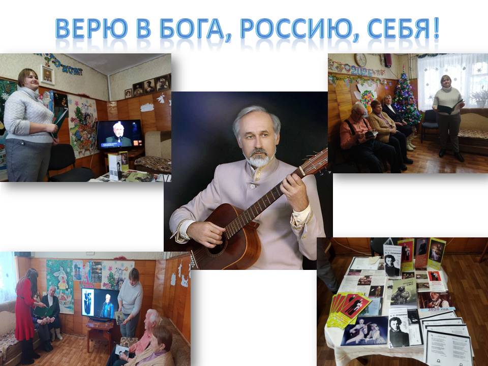 Для слушателей социально-реабилитационного отделения граждан пожилого возраста и инвалидов №2 библиотека-филиала № 7 им. Т. Г. Шевченко провели музыкально-поэтическую гостиную «Верю в Бога, Россию, себя!», к 70-летию со дня рождения К. Ю. Фролова.
