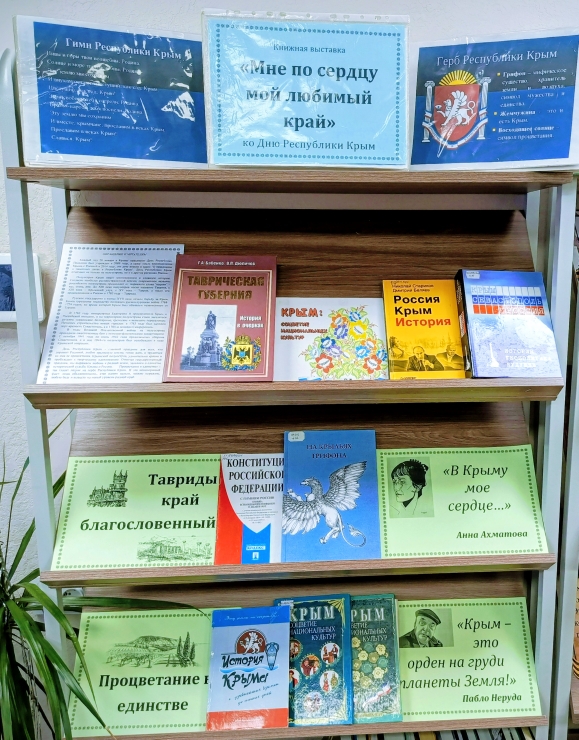 19 января 2026 года в библиотеке–филиале № 7 им. Т.Г.Шевченко г. Симферополя открылась книжная выставка «Мне по сердцу мой любимый край» ко Дню Республики Крым. В первом разделе «Тавриды край благословенный», можно познакомиться с литературой об истории Крыма. В этом разделе представлены книги В. Дюличева, Н. Старикова, Н. Маркетова и периодические издания.