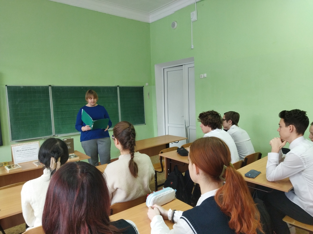 Рассказ сотрудников библиотеки о жизни и творчестве писателя сопровождался просмотром видеофильма: «Жизнь М.Е. Салтыкова-Щедрина» и мультфильма «Премудрый пескарь». Школьники познакомились с представленной литературой на книжной выставке «Путь жизни и борьбы» из фонда библиотеки. В завершении мероприятия была проведена викторина «Персонажи сказок М.Е. Салтыкова-Щедрина».